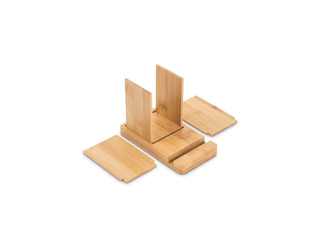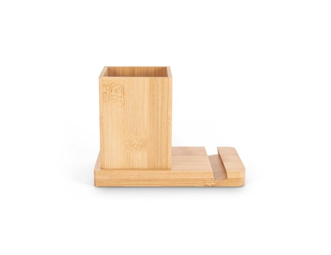 Conjunto de mesa em bambu, ideal para organizar o seu espaço de trabalho. Composto por 1 canaleta para suporte do seu celular e um copo, desmontável, para organizar as suas esferográficas e outros materiais de trabalho. Fornecido em caixa presente de papel kraft reciclado. A cor e o resultado da impressão nos materiais naturais pode variar entre produtos. Dimensões montado: 80 x 145 x 104 mm - Caixa: 80 x 145 x 33 mm