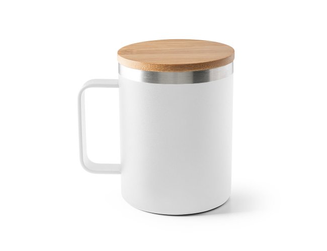 Copo de viagem térmico em aço inox 90% reciclado, com parede dupla isolada a vácuo e tampa em bambu. Esta caneca tem um revestimento em pó que lhe confere mais durabilidade e resistência. Capacidade até 420 mL. Fornecido em caixa presente de papel kraft reciclado. Certificação EU Food Grade. A cor e o resultado da impressão nos materiais naturais pode variar entre produtos. ø88 x 112 mm