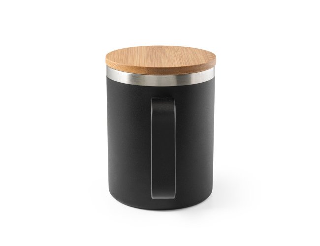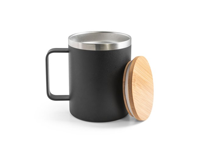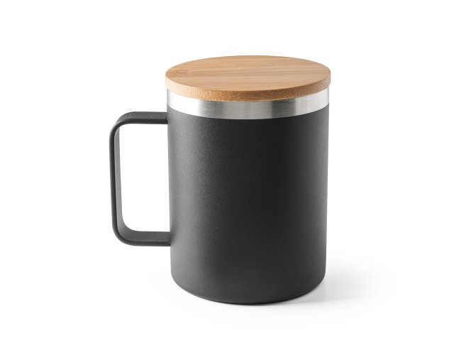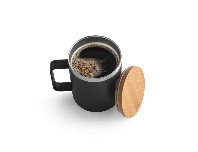 LAUDA. Copo de viagem em aço inox 90% reciclado, térmico com parede dupla isolada a vácuo e tampa em bambu 420 mL