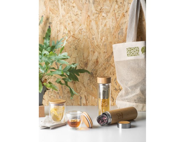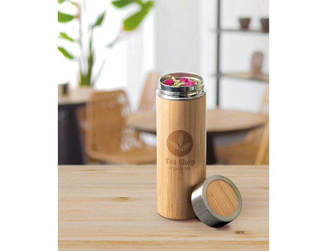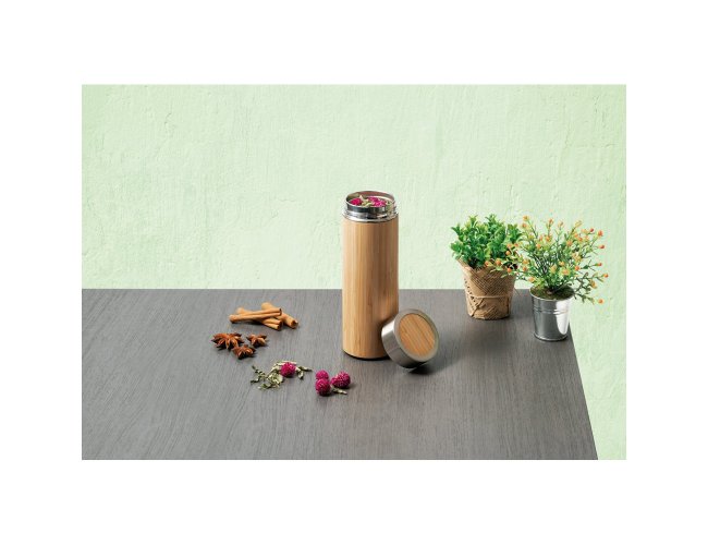 Garrafa em aço inox 90% reciclado e bambu de parede dupla térmica, isolada a vácuo. Possui tampa em aço inox com detalhe em bambu e infusor de chá no interior da garrafa. Capacidade até 430 mL. Preserva as bebidas quentes por 8 horas e as bebidas frias por 12 horas. Fornecido em caixa presente. Certificação EU Food Grade. A cor e o resultado da impressão nos materiais naturais pode variar entre produtos. ø69 x 207 mm - Caixa: 72 x 210 x 72 mm